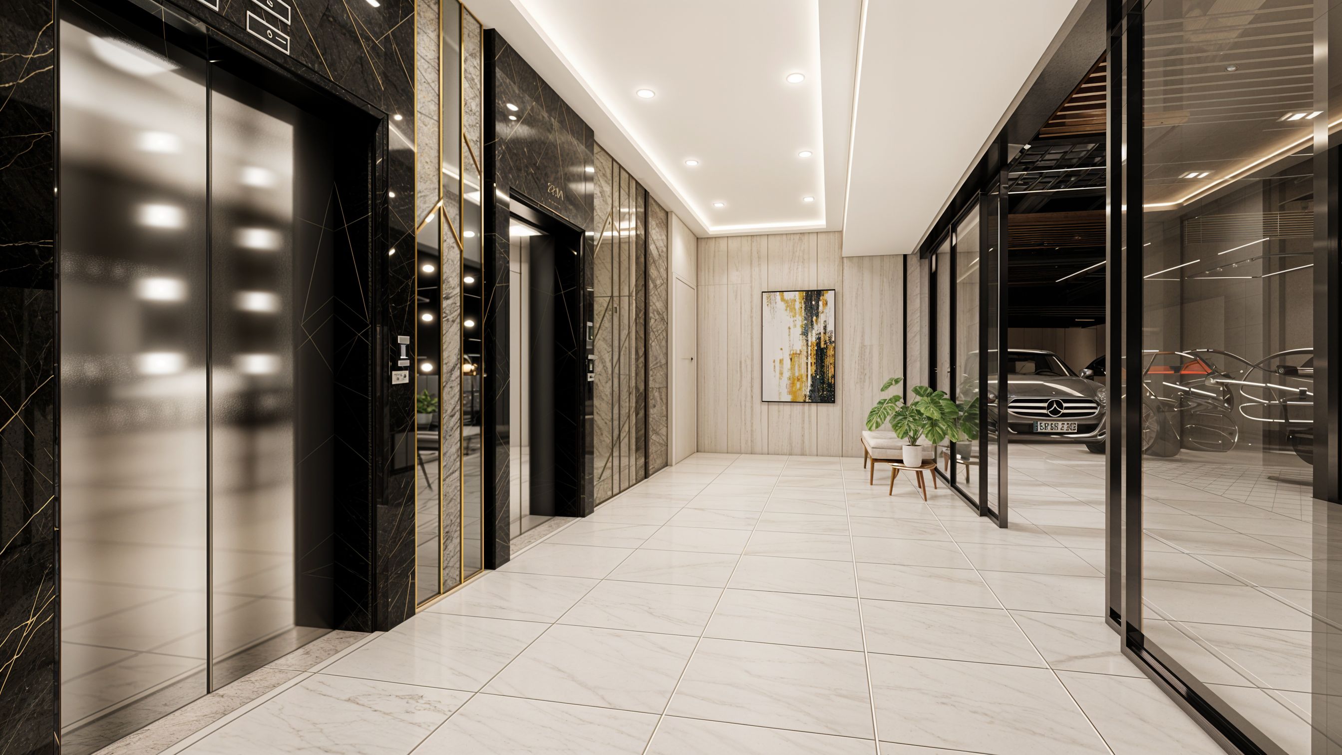 本案從停車場至電梯梯廳,透過一致的設計語彙串聯整體動線。停車場以黑色金屬格柵天花結合線性燈光,形塑俐落有序的空間節奏,同時兼顧美觀、維修與機電整合;灰色六角磚地坪與幾何燈光導引,強化止滑安全與區域辨識性,讓行車與停車動線清晰明確。延伸至電梯梯廳,石材牆面與金屬斜切細節營造精品飯店般的質感焦點,搭配霧面不鏽鋼門片、通透玻璃隔間與木質元素,平衡機能與溫度,使轉換空間在理性秩序中展現細膩層次,提供安全、舒適且具識別度的使用體驗。