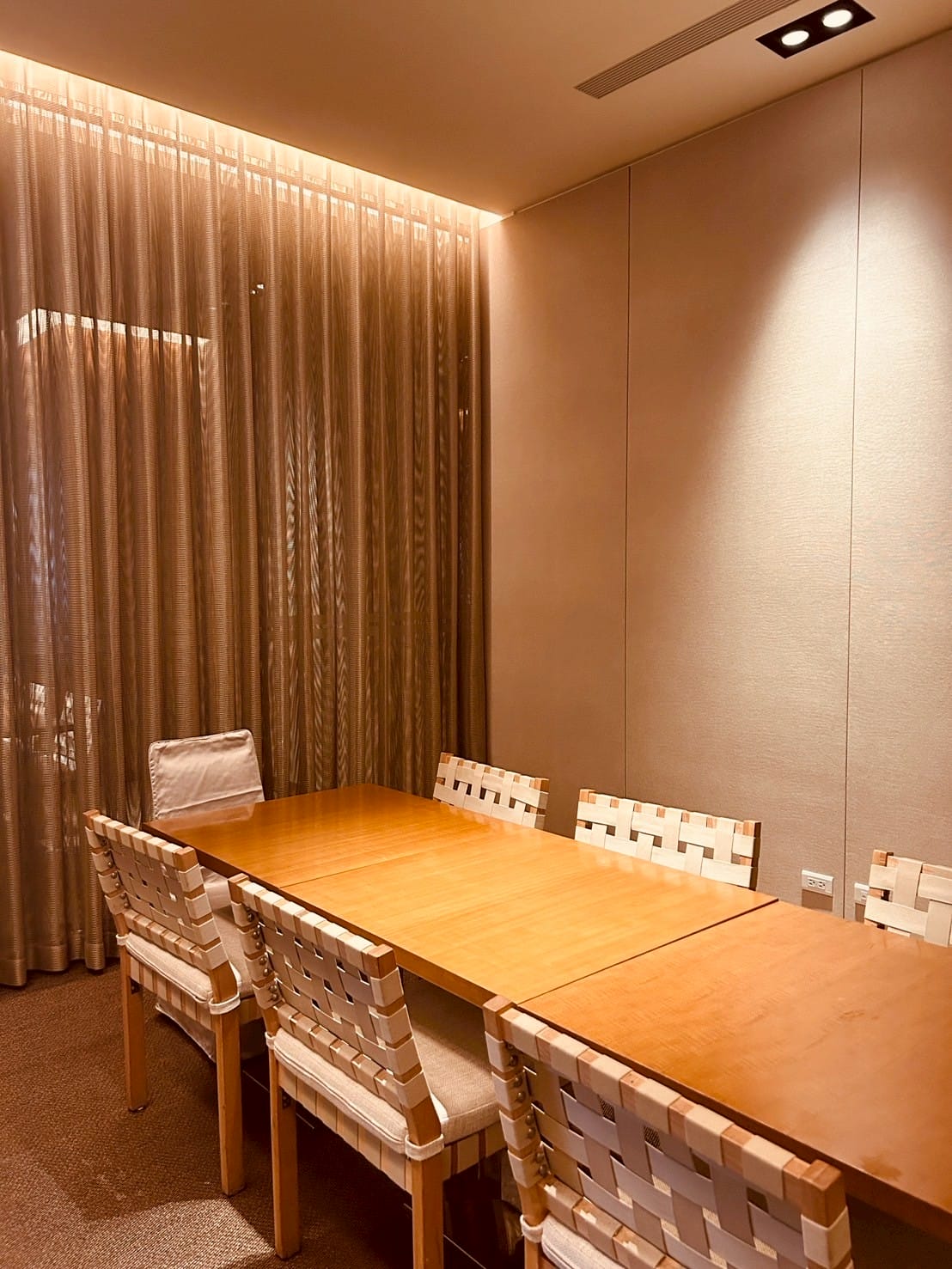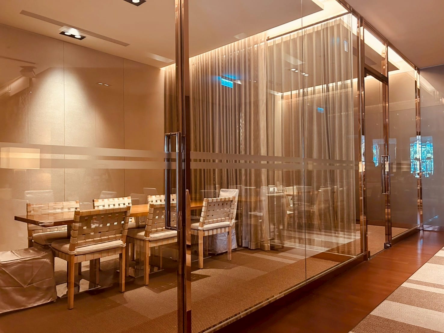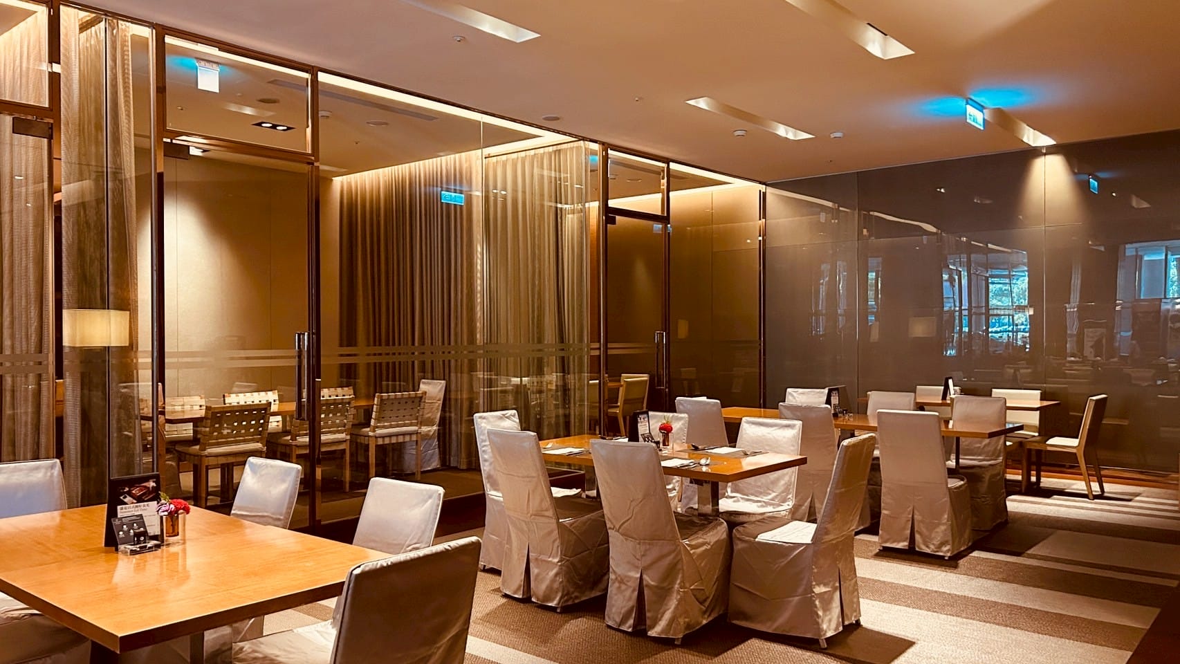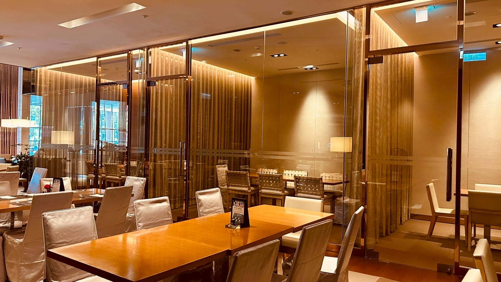 落地玻璃搭配著微量的金屬元素,跟著計算好距離的射燈,打在一桌又一桌的餐桌上,整體設計以溫暖的木質色調與柔和的燈光為主,營造出高雅放鬆的氛圍。並讓佳餚更顯美味。享受舒適溫馨的用餐空間。以大片透明玻璃隔間區分出獨立包廂,玻璃搭配隱約可見的布簾,兼顧隱私與開放感。包廂內有更小的方桌與編織感的椅子,適合小型聚餐或會議。整個空間的燈光設計以間接照明和落地燈為主,帶來柔和的光暈,不刺眼,讓人感覺舒適放鬆。