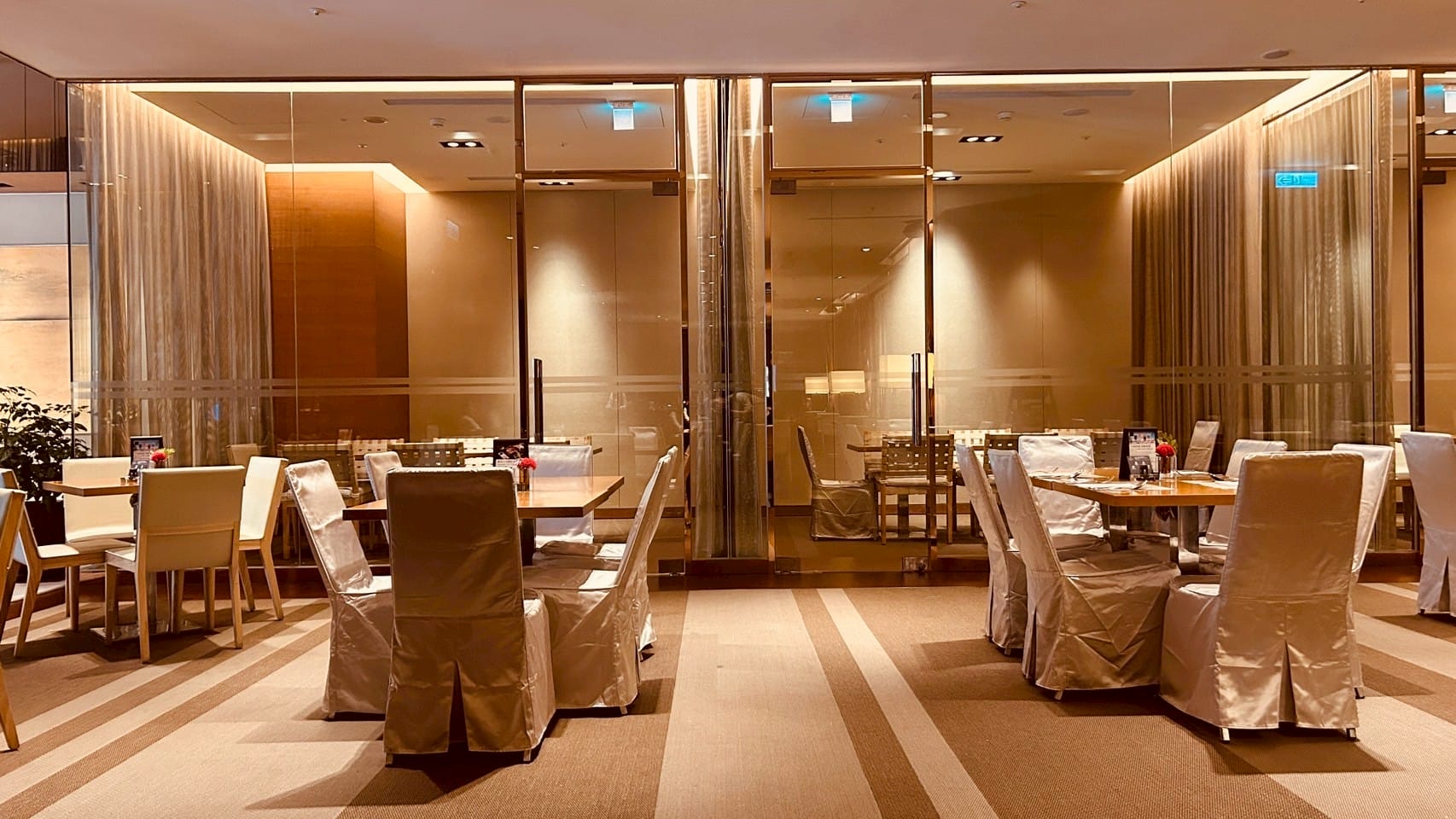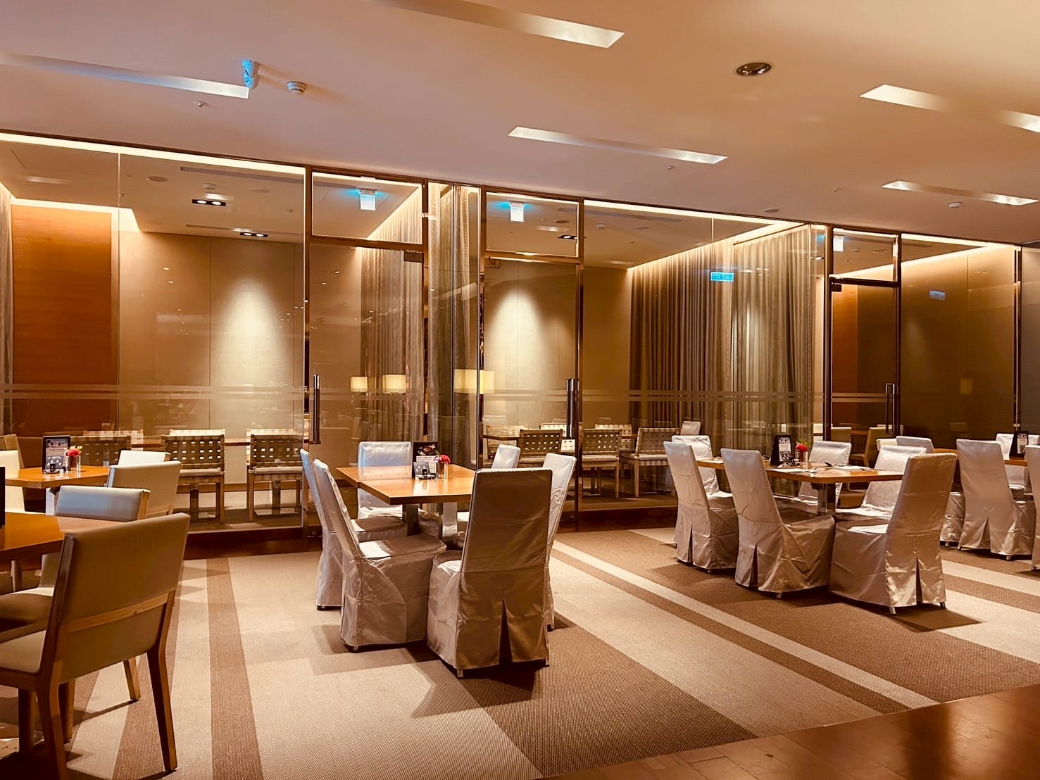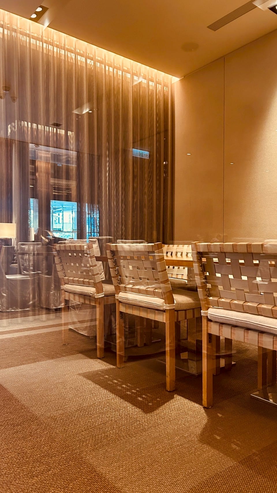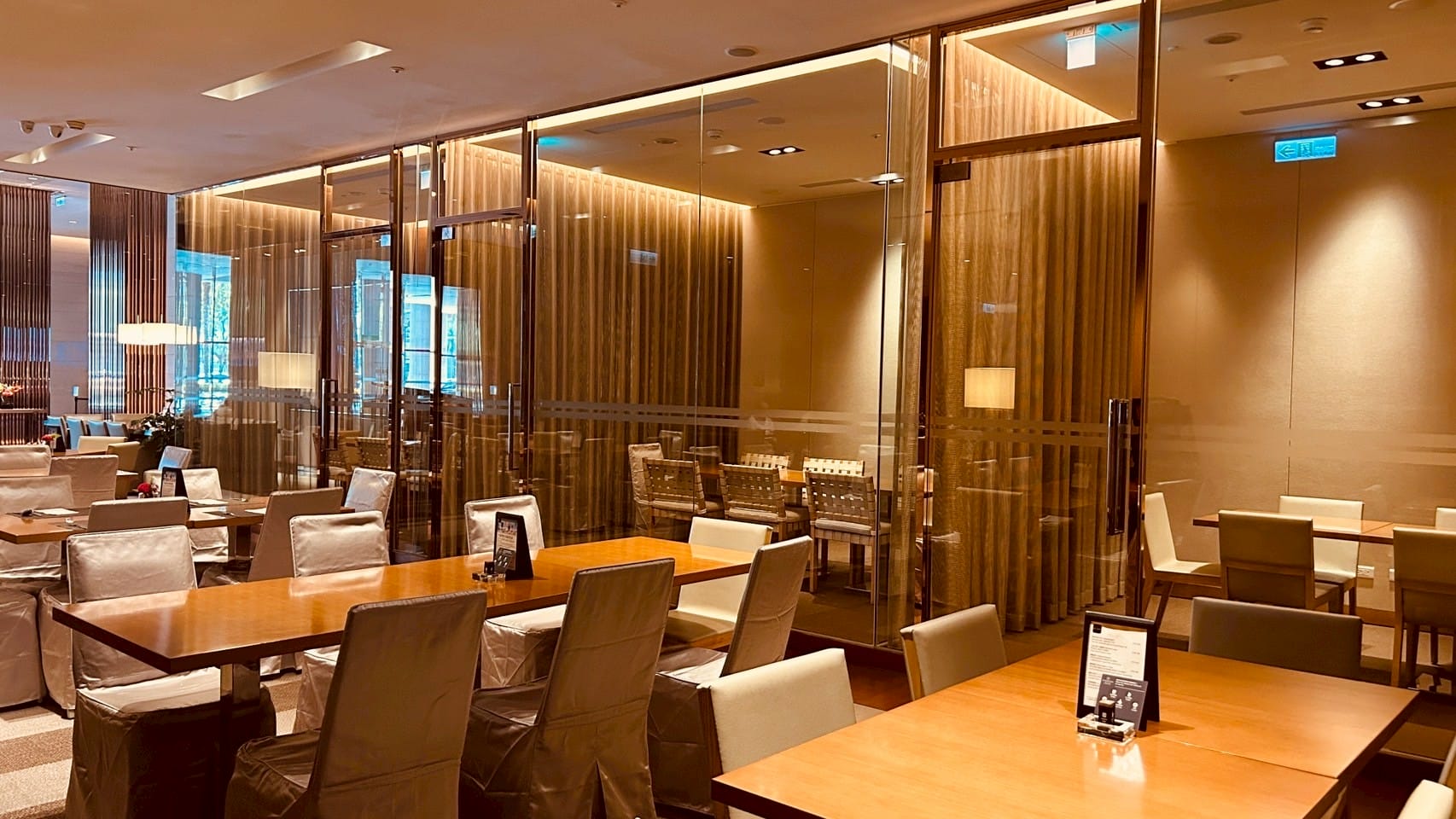 落地玻璃搭配著微量的金屬元素,跟著計算好距離的射燈,打在一桌又一桌的餐桌上,整體設計以溫暖的木質色調與柔和的燈光為主,營造出高雅放鬆的氛圍。並讓佳餚更顯美味。享受舒適溫馨的用餐空間。以大片透明玻璃隔間區分出獨立包廂,玻璃搭配隱約可見的布簾,兼顧隱私與開放感。包廂內有更小的方桌與編織感的椅子,適合小型聚餐或會議。整個空間的燈光設計以間接照明和落地燈為主,帶來柔和的光暈,不刺眼,讓人感覺舒適放鬆。