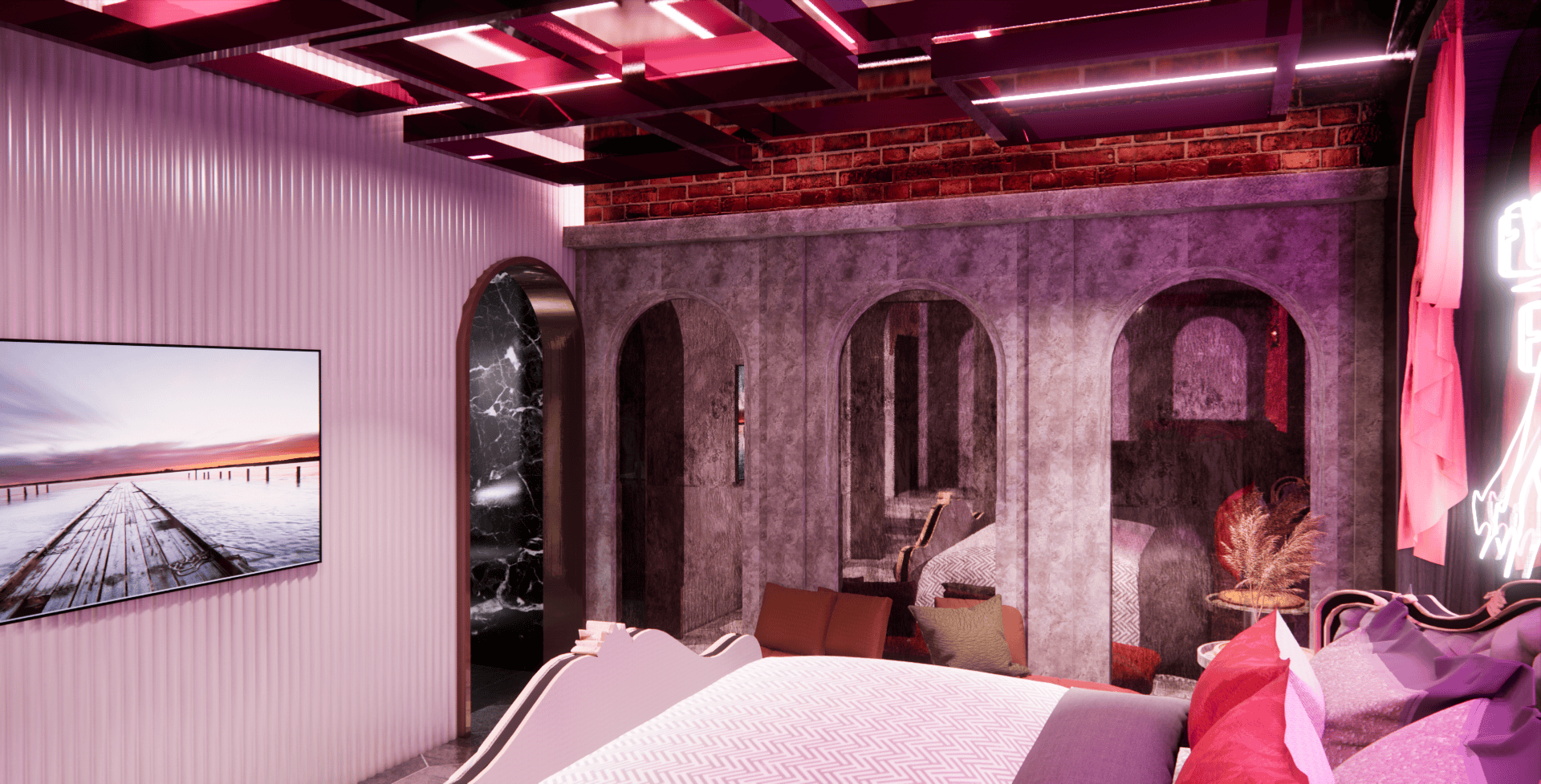 窺見慾望的秘密,盡在此間——這座KTV旅館以情慾釋放為靈感,空間猶如火焰般熱情躍動的佛朗明哥舞曲,誘惑藏於輕柔帷幕之下,若隱若現。鮮紅象徵炙熱渴望,酒紅承載醉人的浪漫與纏綿,邀您探索簾布深處最真實的慾望世界。步入神秘閨房,巴洛克式雕花的床緣低語著新戲的序章。紅藍交織的燈光幻化成醉夢迷離的境界,霓虹燈映襯著女性曲線與字體,讓肢體語言化為紳士之外最深情的表白。激情過後,靜謐的休憩空間由黑色馬賽克磁磚與金色邊條精緻點綴,營造出高雅且幽深的氛圍,成就每一次情感釋放後的完美沉澱。除此之外,旅館設有寬敞奢華的KTV包廂,結合現代音響設備與質感裝潢,讓您與摯愛或摯友在歌聲與低語中放鬆身心,歡聚共鳴,創造值得珍藏的美好時刻。在這裡,情慾與歡樂交織,時間猶如佳釀般細細醞釀,讓每一刻皆成為帷幕之下的延伸。