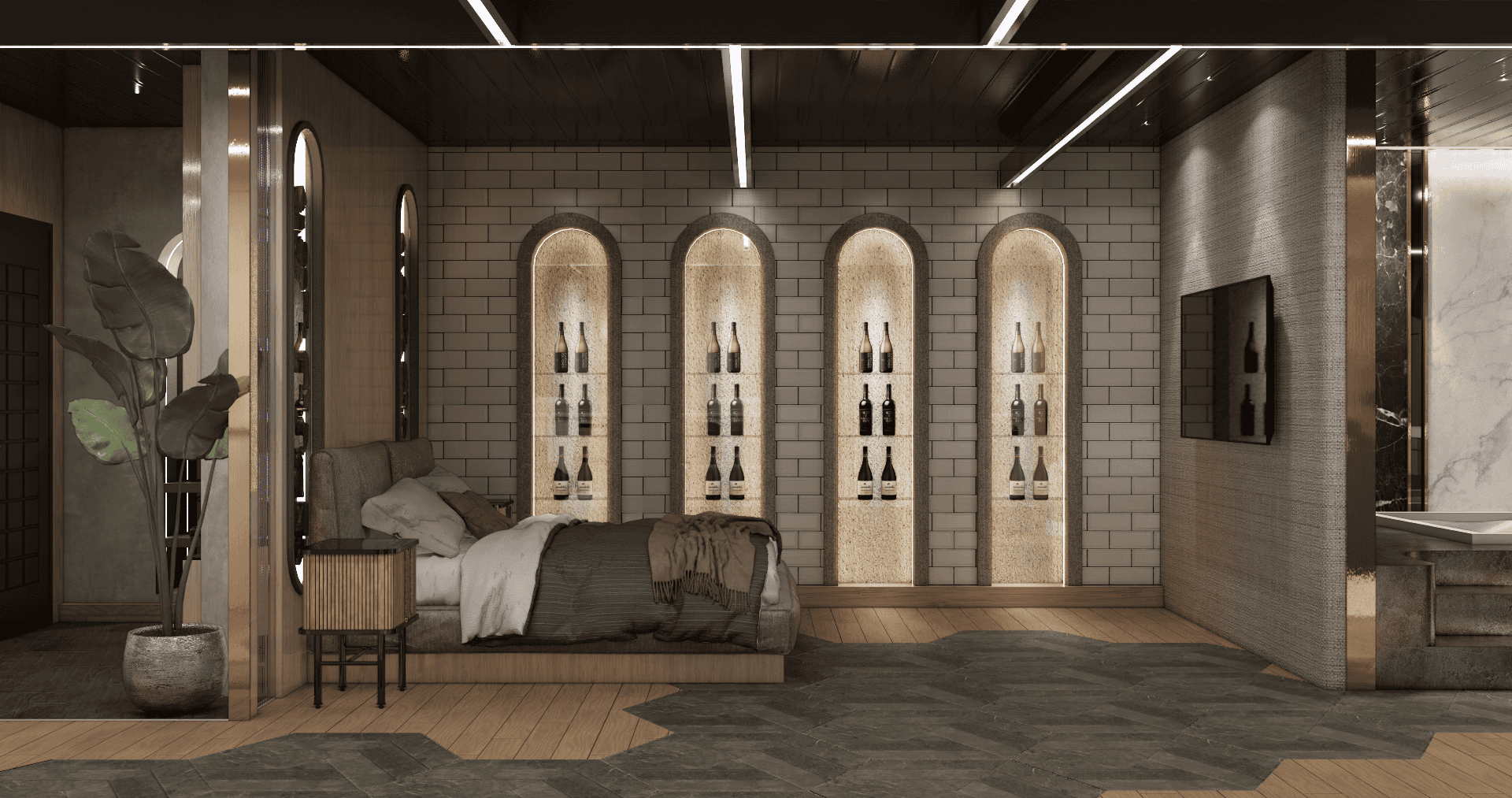窖藏時刻,如同一處時間的秘境,靜靜收藏著歲月的醞釀與沉澱。於此,每一次停駐,皆是與時光緩緩對話的儀式,讓身心在幽暗且溫潤的氛圍中,沉澱出最純粹的寧靜與深意。踏入房間,映入眼簾的是由層層原木細膩堆疊,透過晶瑩玻璃相隔的床頭主牆。它呼應著前廊壁爐中輕輕燃燒的薪火,將木材溫潤的質感與火焰的暖意,巧妙交織於空間之中,營造出溫婉而富有生命律動的氛圍。房內角落的展示牆,採用雅致拱門層層堆砌,收藏著經年窖藏的佳釀。這不僅是一方靜謐的視覺焦點,更是生活美學的低語,輕柔提醒著旅人於流光中守護心底的從容與喜悅。於窖藏時刻,時間猶如甘醇佳釀,於靜謐中馥郁芳香。每一次停留,都是心靈深處一段細膩且永恆的記憶,邀請您細細品味那份屬於歲月的溫柔與永恆。