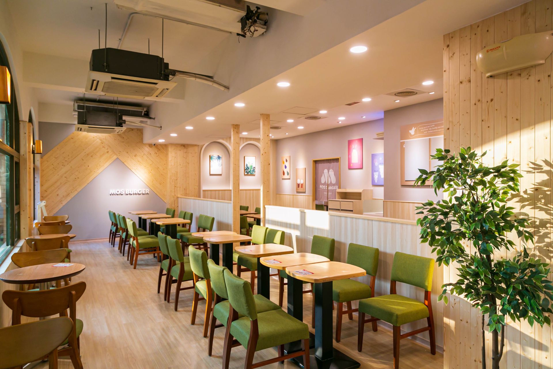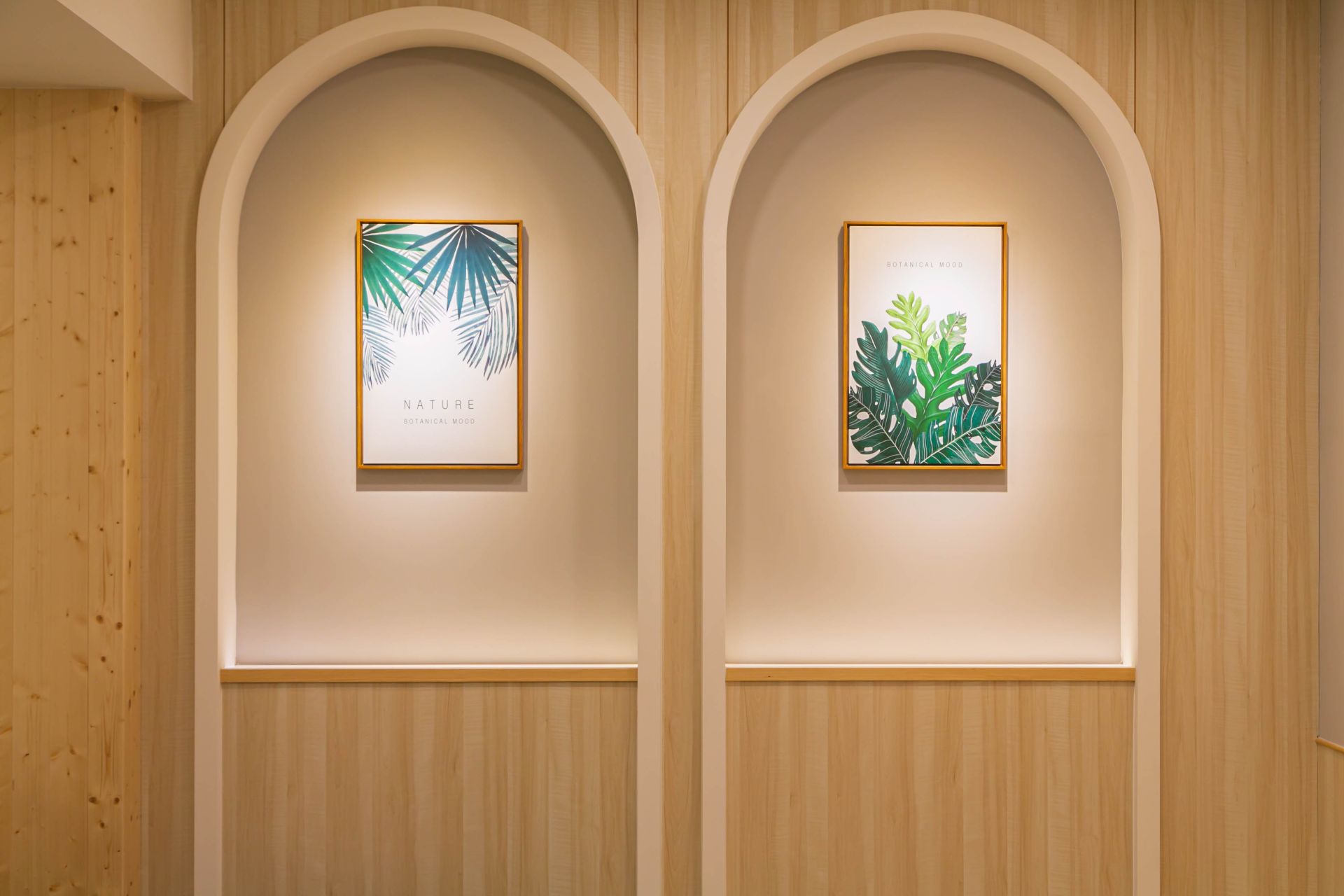 空間佈局強調開放感與功能性,座位區保有適當的用餐間距,不僅提升用餐舒 適度,也使整體氛圍更顯悠然。裝飾上穿插綠意植栽,點綴於牆面與轉角之間,為空間注入自然生命力。且不單只是俐落地直線空間布局,圓弧及異材質穿插讓整體更顯清爽且富有層次變化。