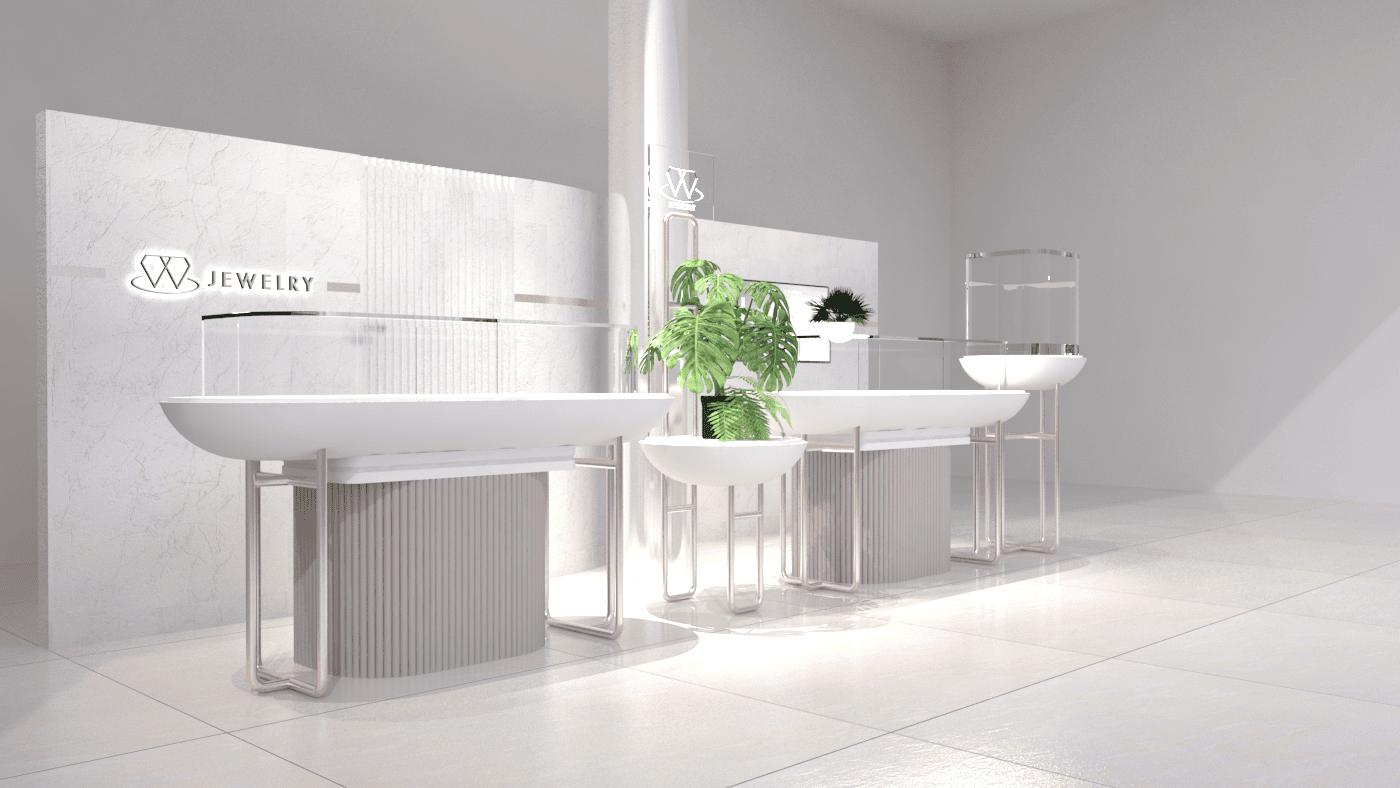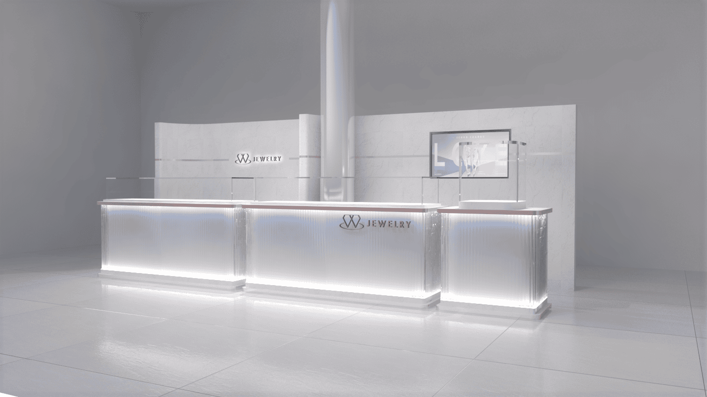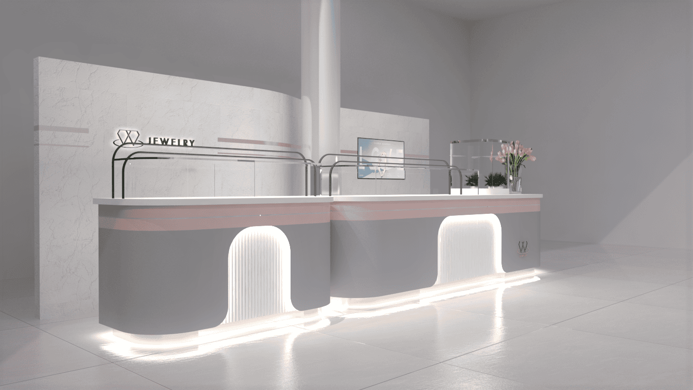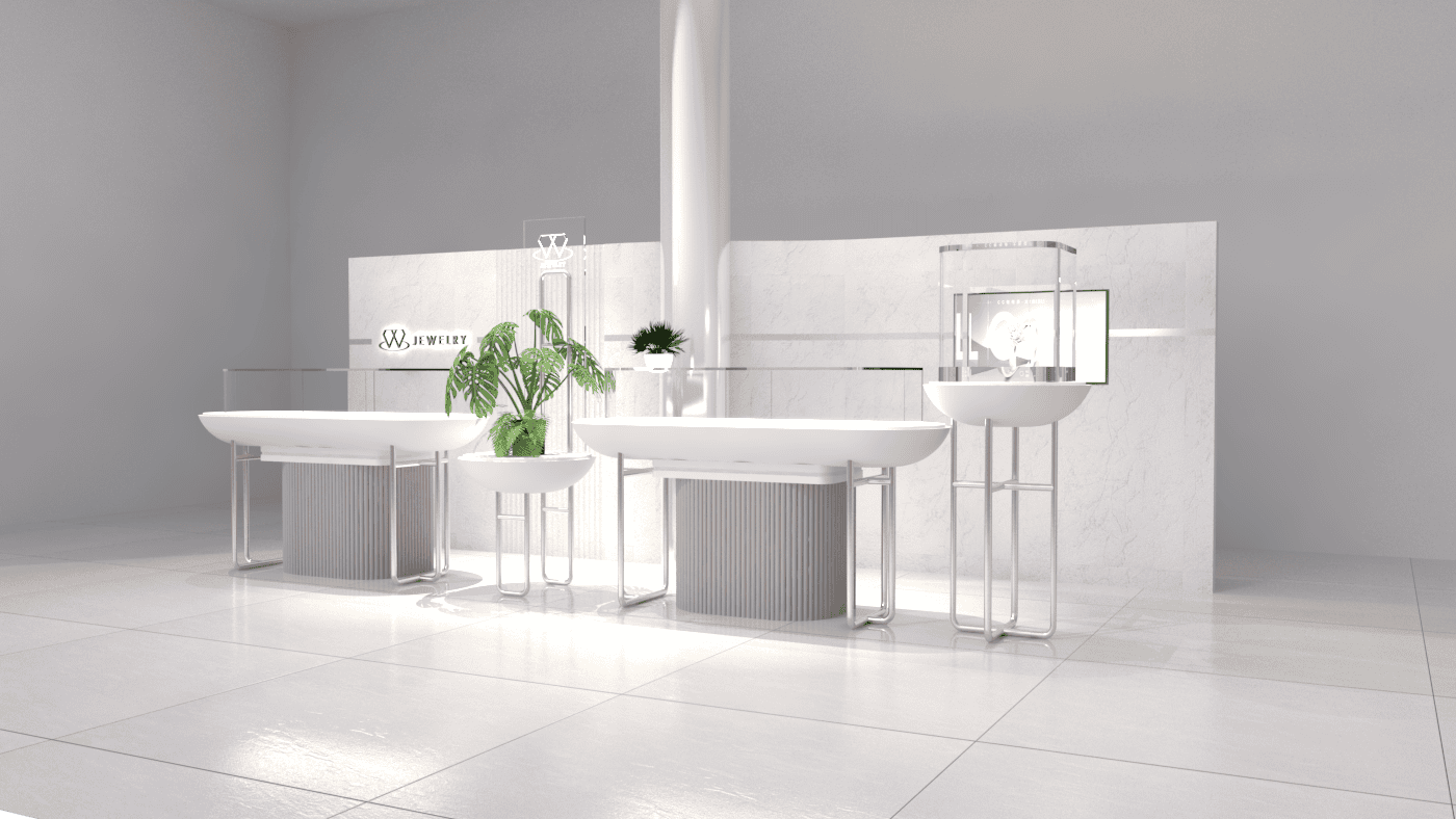 本次展示櫃設計以「船型」為第一階段發想概念,象徵品牌所引進的進口商品來自世界各地,亦傳達出承載與啟航的意象。櫃體支撐結構採用玫瑰金烤漆圓管製作,為整體造型增添一抹低調奢華的金屬質感;船體輪廓結合曲線語彙,使整體造型更具動態與現代感。櫃體背牆則選用仿大理石紋理的美耐板作為主視覺,提升視覺質地與品牌形象。中央以龜背芋植栽作為自然分割與視覺點綴,增添柔和與生氣,也讓陳列空間與綠意互相呼應。第二階段構想則以「通透水晶感」為靈感主軸。整體造型如同一顆剔透璀璨的寶石,主體結構為長虹玻璃柱狀框體,內部透出靛藍漸層彩繪,如同水晶內部的色彩折射,隨著視角變化產生豐富光影效果,成功吸引視覺焦點。內部漸層來自特殊手工漆料繪製,展現出高度工藝美感。桌緣與踢腳部分以玫瑰金金屬鑲邊包覆,提升整體細節質感,形塑優雅而精緻的展示語彙。最終定案版本則以「多面體珠寶切割」為核心語彙,透過三角分割構成呈現如同寶石多面折射般的立體結構。此設計不僅具備強烈的造型感與辨識度,也在機能性上考量模組化組裝的便利性。各個櫃體單元可於固定尺寸中拆解與運輸,提升實際使用與施工效率,同時保有精緻設計的完整呈現。整體設計兼顧品牌象徵、視覺吸引力與實務需求,透過三種構想的演進,最終凝鍊為兼具形象力與靈活度的展示方案,為空間注入強烈的辨識度與美學品味。