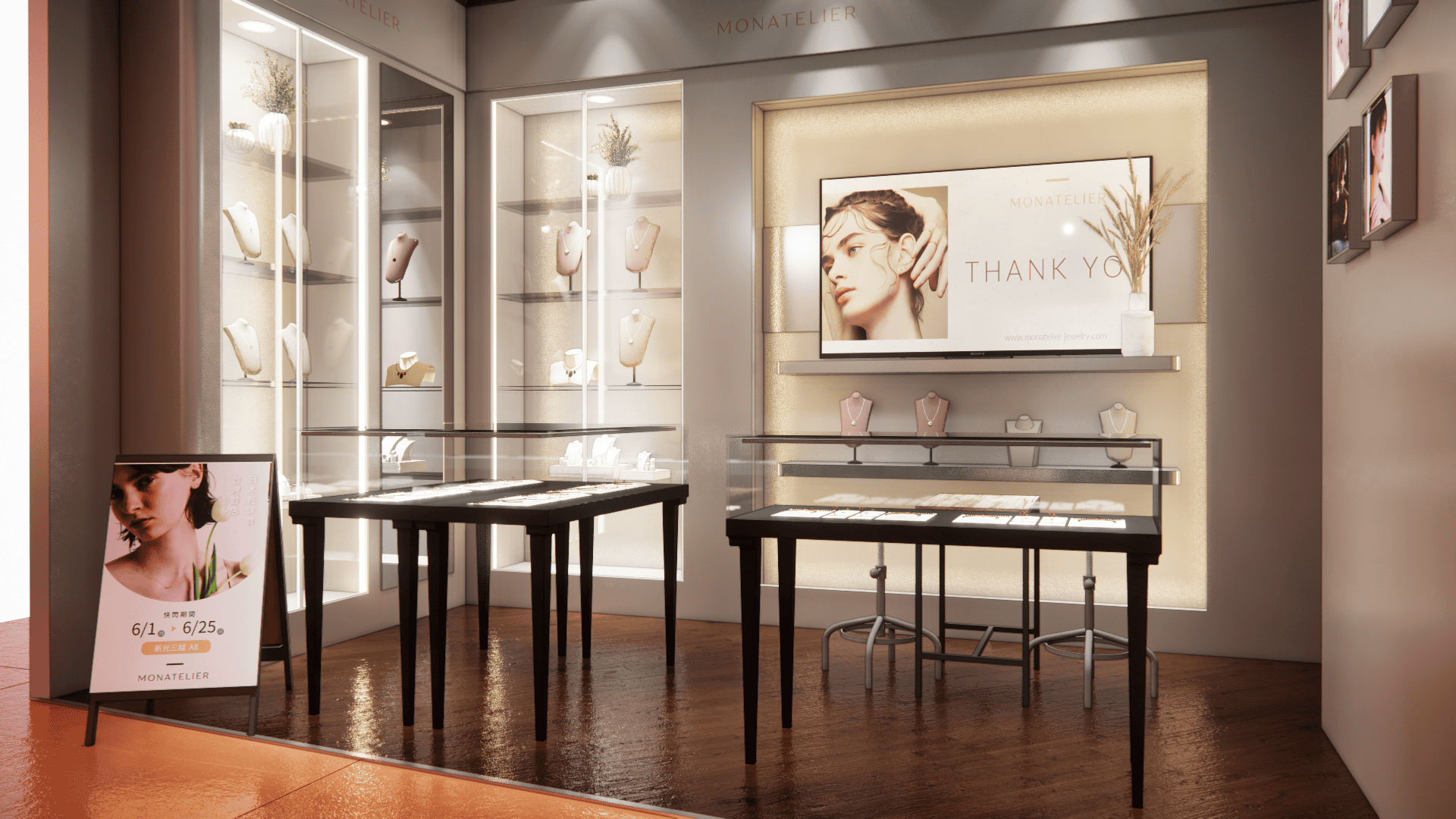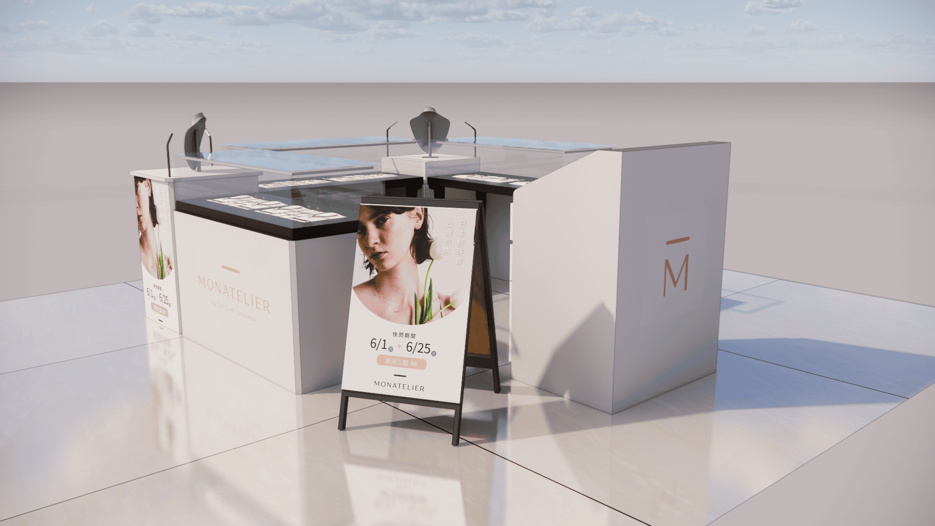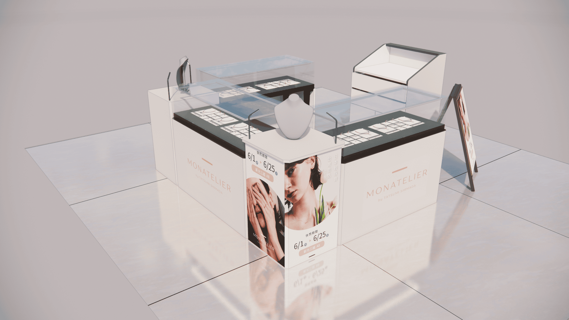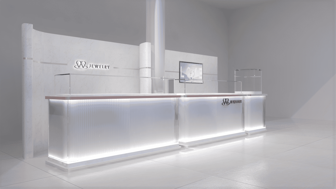 本次展示櫃設計以「船型」為第一階段發想概念,象徵品牌所引進的進口商品來自世界各地,亦傳達出承載與啟航的意象。櫃體支撐結構採用玫瑰金烤漆圓管製作,為整體造型增添一抹低調奢華的金屬質感;船體輪廓結合曲線語彙,使整體造型更具動態與現代感。櫃體背牆則選用仿大理石紋理的美耐板作為主視覺,提升視覺質地與品牌形象。中央以龜背芋植栽作為自然分割與視覺點綴,增添柔和與生氣,也讓陳列空間與綠意互相呼應。第二階段構想則以「通透水晶感」為靈感主軸。整體造型如同一顆剔透璀璨的寶石,主體結構為長虹玻璃柱狀框體,內部透出靛藍漸層彩繪,如同水晶內部的色彩折射,隨著視角變化產生豐富光影效果,成功吸引視覺焦點。內部漸層來自特殊手工漆料繪製,展現出高度工藝美感。桌緣與踢腳部分以玫瑰金金屬鑲邊包覆,提升整體細節質感,形塑優雅而精緻的展示語彙。最終定案版本則以「多面體珠寶切割」為核心語彙,透過三角分割構成呈現如同寶石多面折射般的立體結構。此設計不僅具備強烈的造型感與辨識度,也在機能性上考量模組化組裝的便利性。各個櫃體單元可於固定尺寸中拆解與運輸,提升實際使用與施工效率,同時保有精緻設計的完整呈現。整體設計兼顧品牌象徵、視覺吸引力與實務需求,透過三種構想的演進,最終凝鍊為兼具形象力與靈活度的展示方案,為空間注入強烈的辨識度與美學品味。